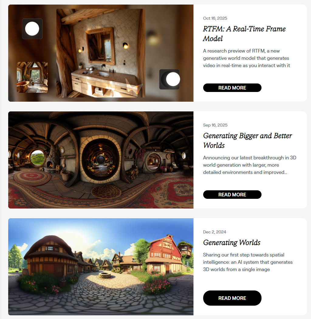 ▲图2|李飞飞创办的World Labs已经开放三代不同的世界模型供在线体验,小编建议各位读者点击链接亲身感受world model的神奇能力,看看完全由AI生成的“物理世界”(https://www.worldlabs.ai/blog)