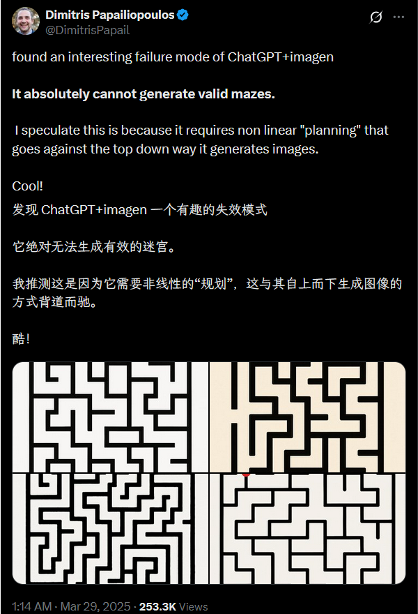 ▲图1|曾经的外国网友做了一个有趣的实验:他让ChatGPT-4o生成迷宫的图片,却发现这些迷宫都是无法走通的