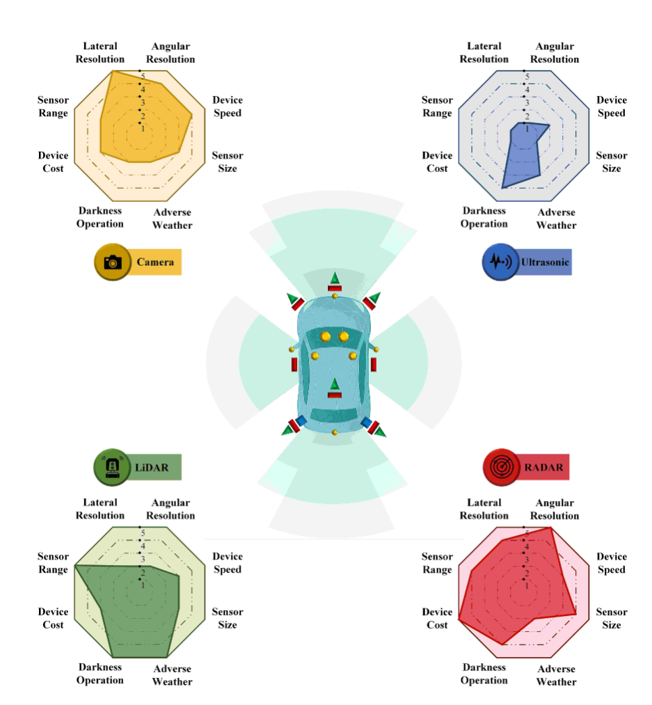图7|自动驾驶中主要传感器的类别与感知性能概览。感知性能按 1–5 进行评分,1=很低,2=低,3=中等,4=高,5=很高