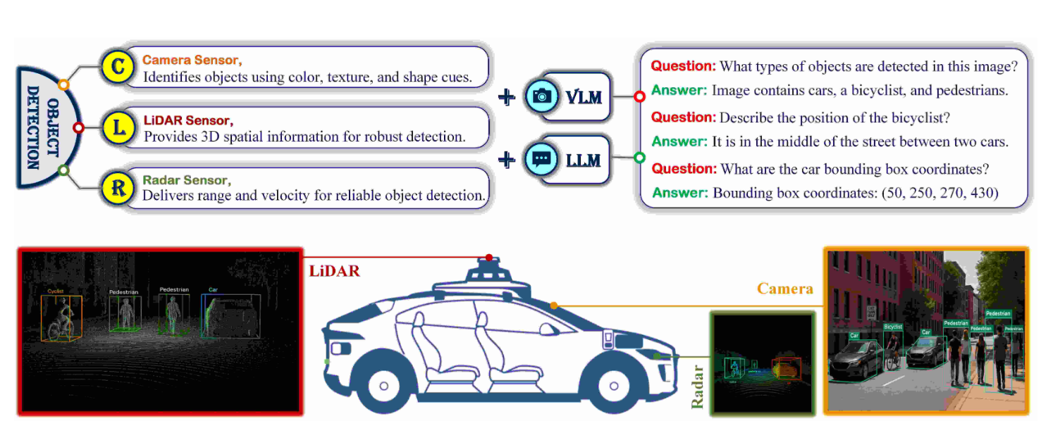 图11|当前自动驾驶多模态传感器下的目标检测可视化:RGB 图像展示了包含车辆、行人和骑行者的二维检测;LiDAR 与 Radar 点云通过空间对齐的三维框完成 3D 检测。多模态 AI(包括 LLM 与 VLM)的融合,使系统能够结合视觉与空间信息,实现更丰富的场景理解与更高的检测准确度
