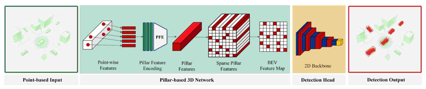 每个 pillar 内的点通过轻量化 PointNet 编码,再被映射成 BEV 平面上的 pseudo-image 特征,后续即可使用标准的 2D CNN 完成检测。
