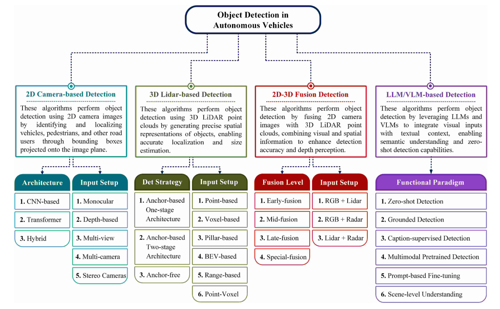 图1|自动驾驶目标检测方法的完整分类体系。根据传感器配置、数据表示、融合策略与模型结构,将方法划分为四大类及其代表性子类