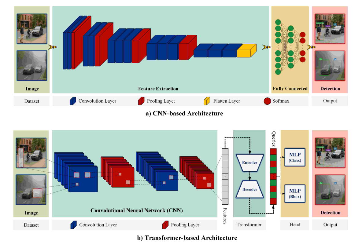 图2|二维摄像头检测方法的整体框架。(a) CNN-based 模型的一般结构;(b) Transformer-based 模型的一般结构