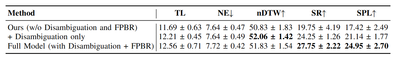 ● Disambiguation模块负责检测“困惑状态”,当机器人发现指令模糊或目标不清时,会触发一次360°扫描,重新构建场景并更新轨迹摘要;