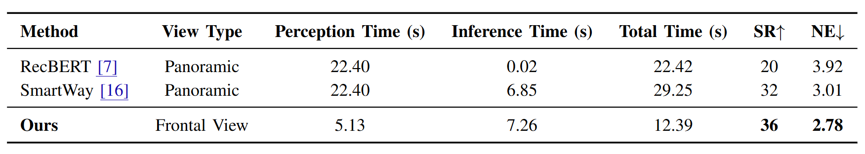 这种设计显著降低了系统延迟:在真实机器人上,平均每步总耗时仅12.39秒,仅为SmartWay的42.4%,并且减少视觉输入并不会削弱模型表现,反而使导航更快、更稳定、更易部署。