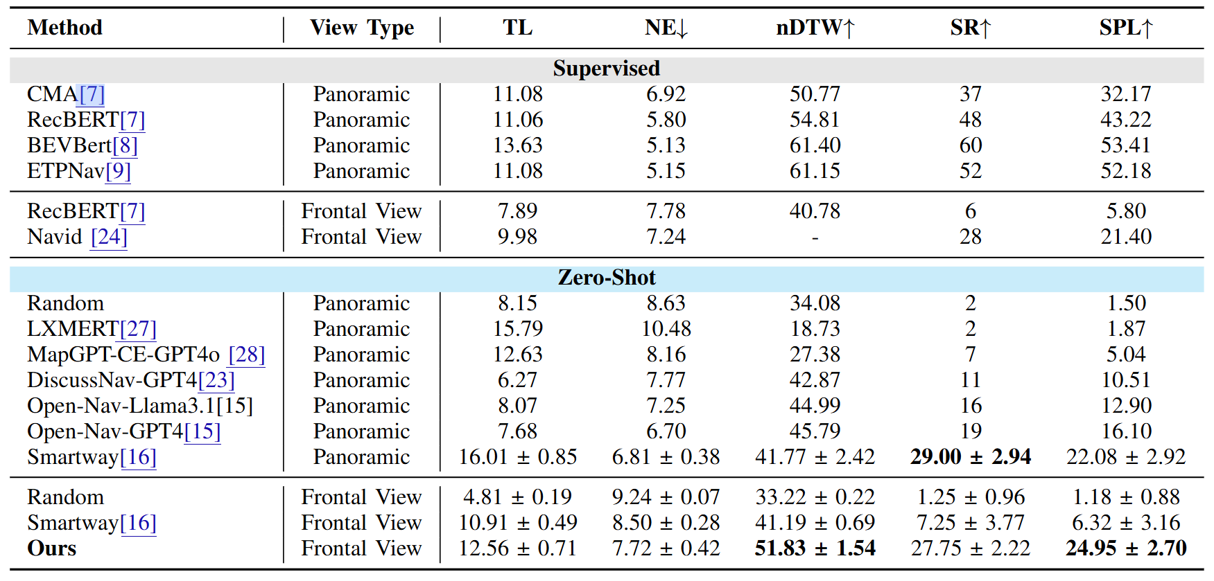 在模拟环境 R2R-CE 中,它的 成功率 SR=27.75,SPL=24.95,与使用全景输入的前作SmartWay(SR=29,SPL=22.08)不相上下,超过了Open-Nav-GPT4(SR=19, SPL=16.1)。