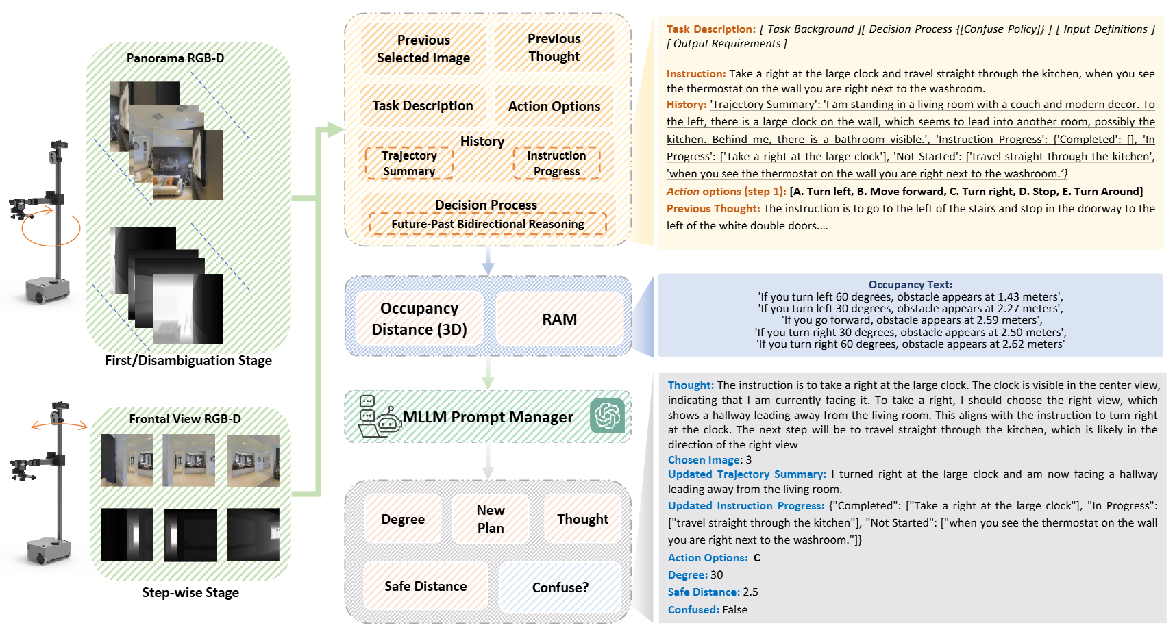 为了让模型理解空间结构,作者设计了一个 空间-语义文本描述模块:它将深度图中的障碍信息转成自然语言提示,比如“向左30°方向有障碍物2.5米”,再与识别出的语义物体(如“钟表”“厨房”“楼梯”)一并组成提示输入。