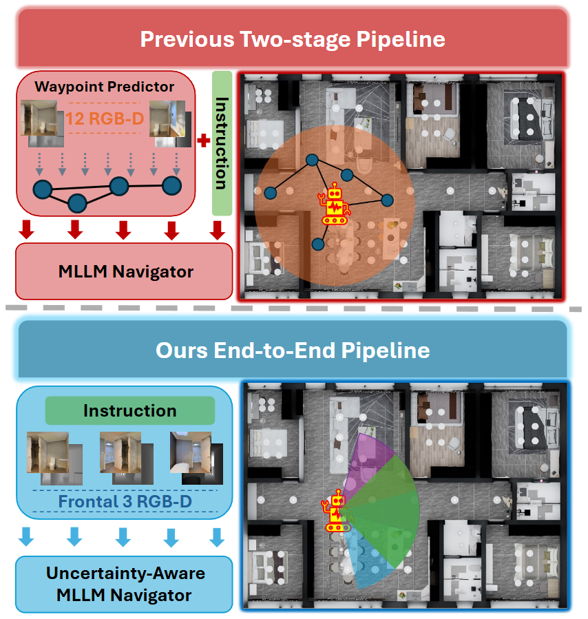 在以往的导航系统里,机器人要先用360°相机生成全景图,再由waypoint预测器挑出几个可能的候选点,最后交给大语言模型(LLM)来判断往哪走。这种两阶段流程不仅慢,而且各模块割裂:预测器只看RGB-D,根本不了解语言语义。