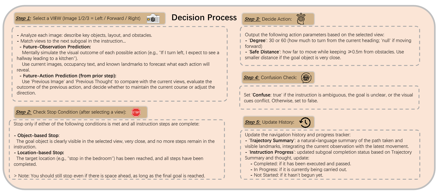 图3|这张图展示了Fast-SmartWay在每一步的决策流程。MLLM会综合当前三视图、历史轨迹和指令内容,依次评估候选方向、预测未来视野、分析上一步的动作结果,并判断是否需要停下或转向。最终输出包括“选定方向”“旋转角度”和“安全前进距离”等关键参数,让机器人实现思考式的逐步导航