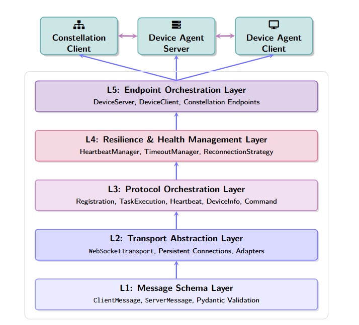 图4|AIP 协议栈结构。五层协议框架,为多智能体之间提供持久、可靠的跨设备通信能力