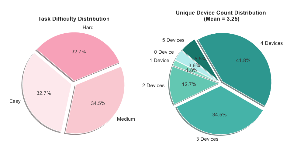 图7|NebulaBench 任务分布。左图为不同难度任务的比例,右图为每个任务所涉及的设备数量统计