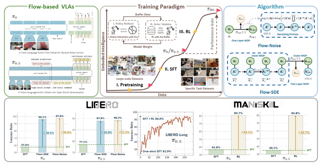 通过这两种机制,πRL 实现了让“流模型”真正能在环境中以 RL 方式自我优化的能力。