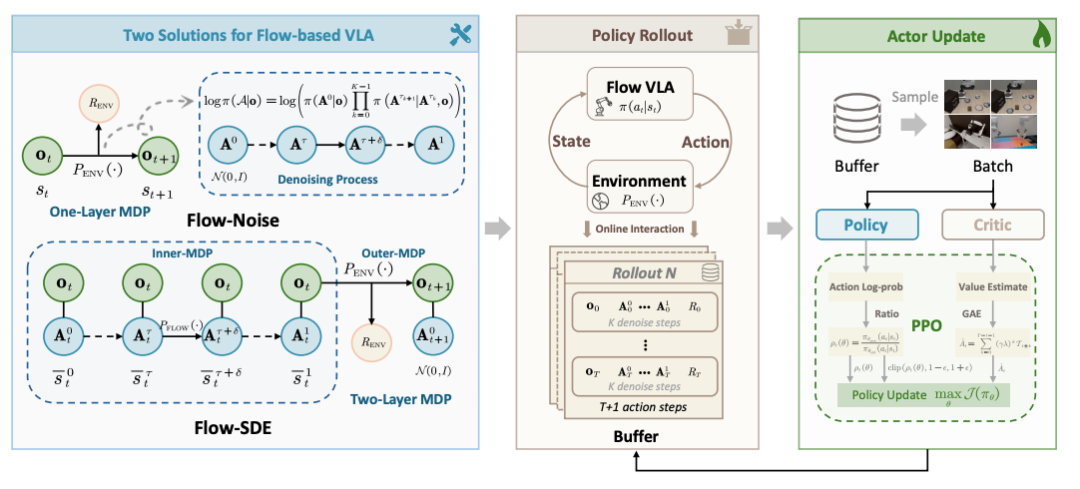 目前,针对流匹配VLA的强化学习方法仍较为缺乏,主流研究多集中于自回归架构的VLA(如OpenVLA)。其核心挑战在于:流匹配模型通过迭代去噪生成动作,难以直接计算动作的对数似然,而这正是PPO、GRPO等策略梯度算法更新的关键。