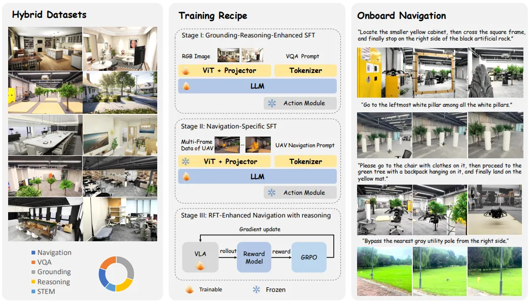 从结构上看,系统用视觉编码器把图像变成特征,经投影对齐到语言模型,再由动作模块生成包含 3D 航点、偏航等在内的动作表达,还配了任务重规划与完成判断的逻辑。也就是说,它不是只做“回答”,而是在做“持续导航”。
