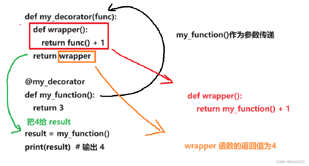 装饰器中嵌套了 wrapper() 函数,并且返回值是 wrapper ,所以实际上我们就是调用了 wrapper()这个函数,并将这个函数的返回值作为装饰器的返回值传递。