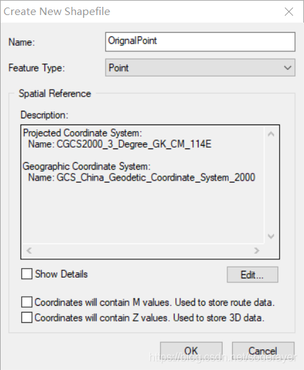 在arcgis Catalog中创建原始图层数据,为空图层数据,命名为OriginalPoint.shp。投影坐标选择GCS2000。