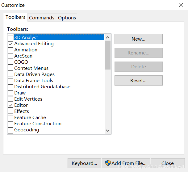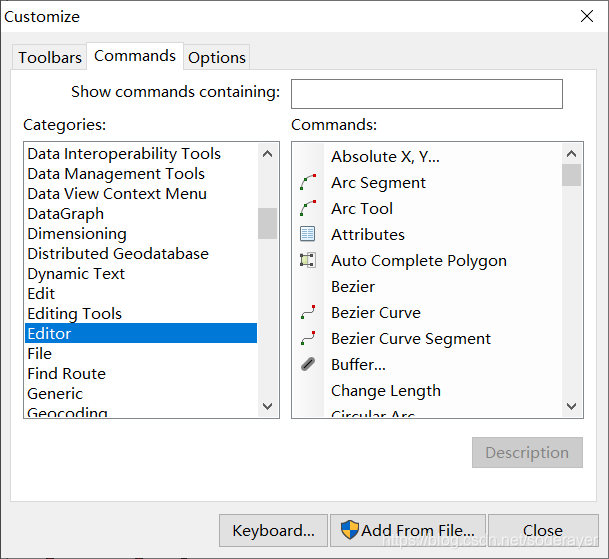 切换到Commands面板,找到Editor工具,这里面有许多工具,有很多都没有添加到工具条中。
