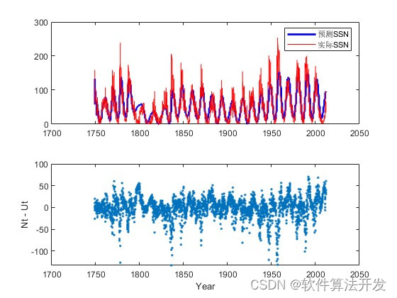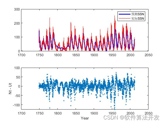 基于最小二乘法的太阳黑子活动模型参数辨识和预测matlab仿真。太阳黑子是人们最早发现也是人们最熟悉的一种太阳表面活动。因为太阳内部磁场发生变化,太阳黑子的数量并不是固定的,它会随着时间的变化而上下波动,每隔一定时间会达到一个最高点,这段时间就被称之为一个太阳黑子周期。太阳黑子的活动呈现周期性变化是由施瓦贝首次发现的。沃尔夫 (R.Wolfer)继而推算出11年的周期规律。实际上,太阳黑子的活动不仅呈11年的周期变化,还有海耳在研究太阳黑子磁场分布时发现的22年周期;格莱斯堡等人发现的80年周期以及蒙德极小期等。由于太阳黑子的活动规律极其复杂,时至今日科学家们仍在努力研究其内在的规律和特性。事实上,对太阳黑子活动规律的研究不仅具有理论意义,而且具有直接的应用需求。太阳黑子的活动呈现周期性变化的,沃尔夫(R.Wolfer)根据在过去的288 年(1700年~1987 年)间每年太阳黑子出现的数量和大小的观测数据推算出11 年的周期规律。我们利用Matlab强大的数据处理与仿真功能,对Wolfer数进行功率谱密度分析从而可以得到对太阳黑子活动周期的结论。