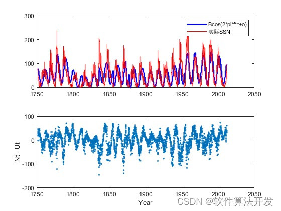 假设我们有一个拟合模型 f(x,θ),其中x 是时间变量,θ=[θ1,θ2,...,θn] 是待估计的模型参数向量。已知一系列太阳黑子活动观测数据yi 对应于时间点 xi (i=1, 2, ..., m),目标是通过调整参数 θ 来使模型输出与实际观测值之间的误差平方和最小。这个优化问题可以用以下数学公式表示: