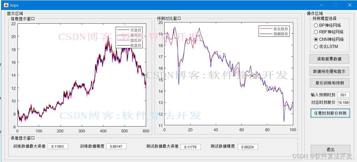 基于CNN卷积神经网络的金融数据预测matlab仿真,带GUI界面,对比BP,RBF,LSTM.
