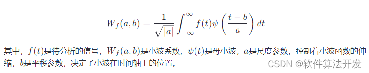 小波变换是一种时频分析工具,相比传统的傅里叶变换,它在时域和频域都提供了更高的分辨率。小波基函数是一系列具有有限支撑、良好的局部化特性和一定的衰减性质的函数。小波变换的基本形式可以表示为: