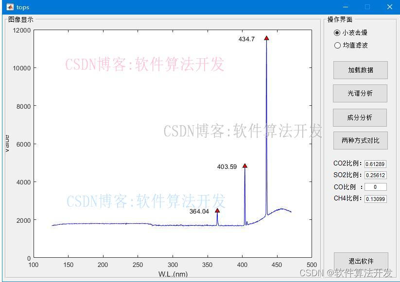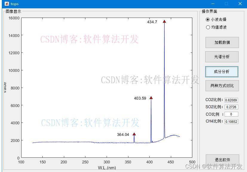 基于小波变换和峰值搜索的光谱检测matlab仿真,带GUI界面.对光谱数据的成分进行提取,分析CO2,SO2,CO以及CH4四种成分比例。