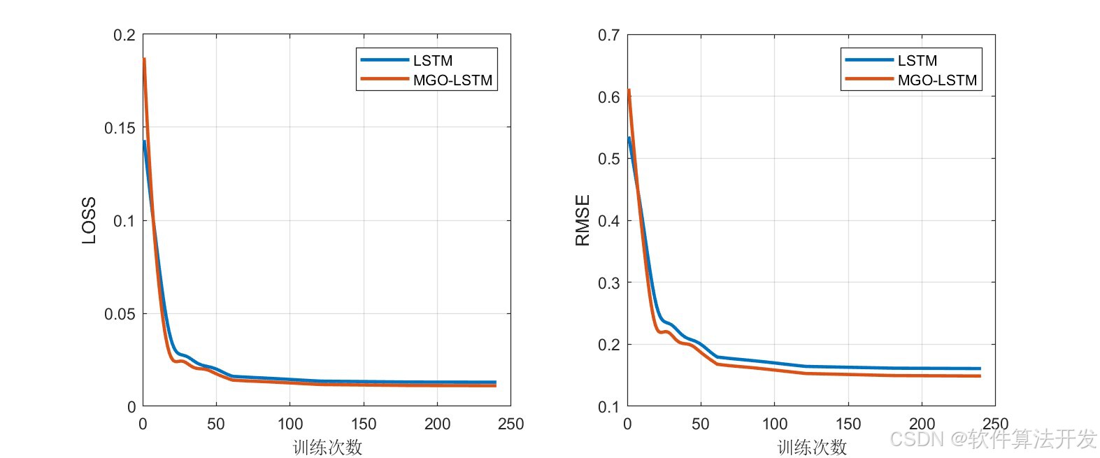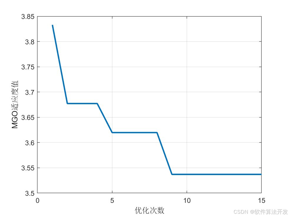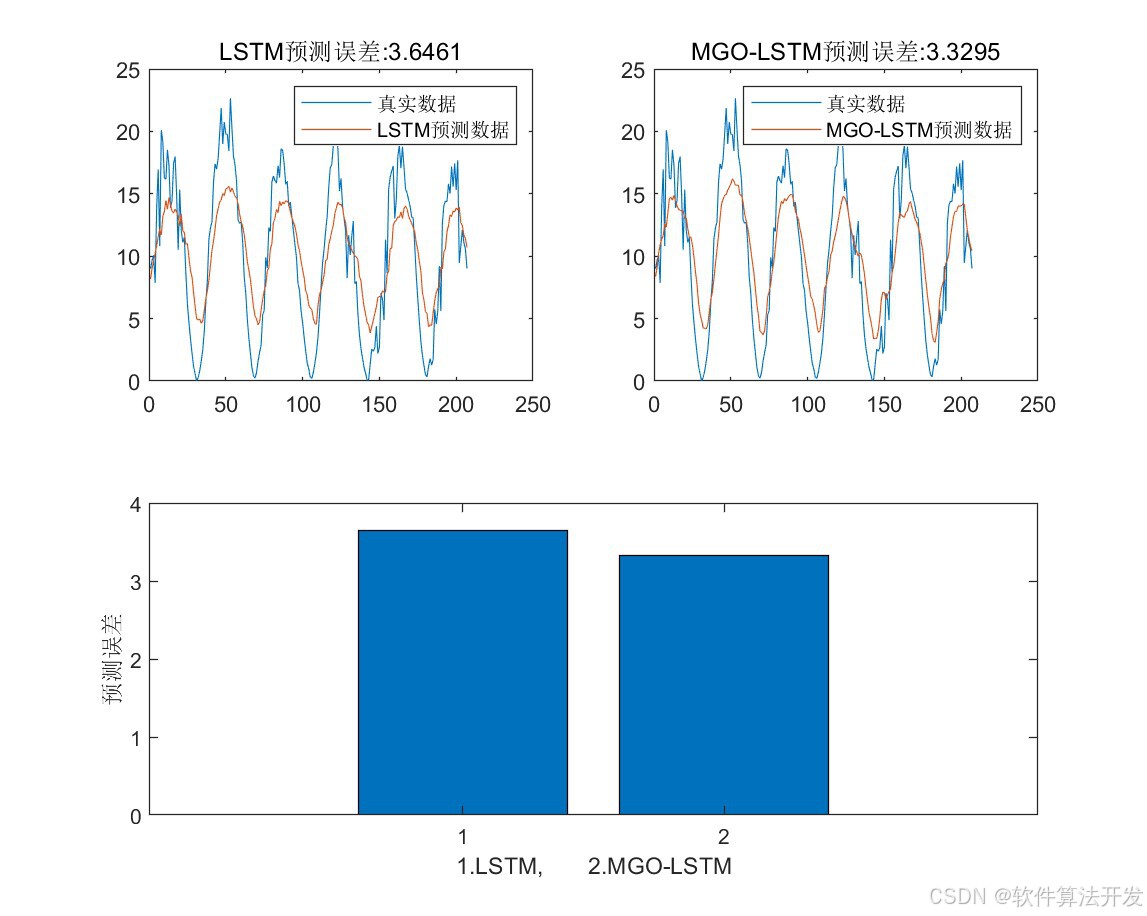 MGO-LSTM模型的核心是将LSTM的关键超参数(本程序中为隐藏层神经元数量)作为MGO的优化变量,将LSTM的预测误差(如均方误差MSE)作为MGO的适应度函数,通过MGO在预设的超参数搜索空间中迭代搜索,找到使LSTM预测性能最优的超参数组合,再用该最优超参数构建并训练LSTM模型,最终实现一维时间序列的高精度预测。