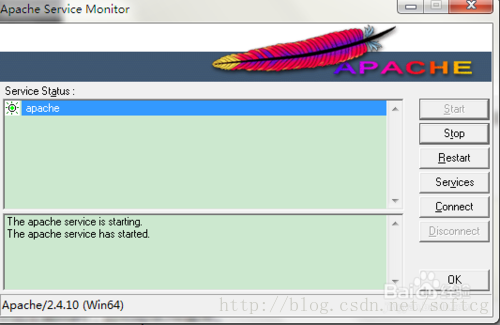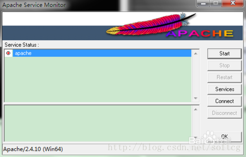 在安装目录中,找到D:\application_software\Apache\bin\ApacheMonitor.exe可执行文件,双击运行,桌面右下角会出现图标,双击打开窗口界面,会看到如图所示: