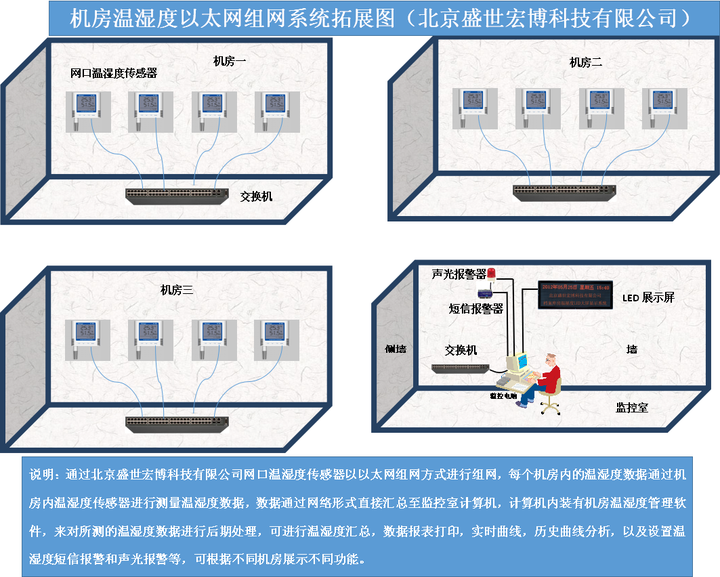 4. 集中化管理:搭建统一监控平台,支持对所有户外机房、配电柜的温湿度数据进行集中展示、存储与分析,便于管理人员远程查看、历史数据追溯及设备运维。