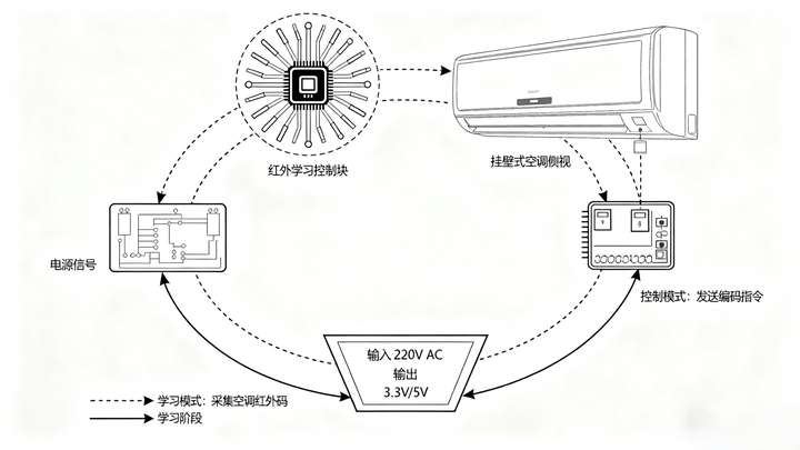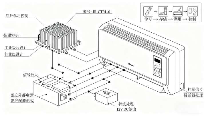 HB-KK30D 智能型空调控制传感器搭载标准 RS485 通讯接口,凭借先进的串口指令学习功能,可实现对市面上 99% 带遥控器设备的精准控制,涵盖空调、电视等主流家电及商用设备,为各类场景的智能控制需求提供高效解决方案。