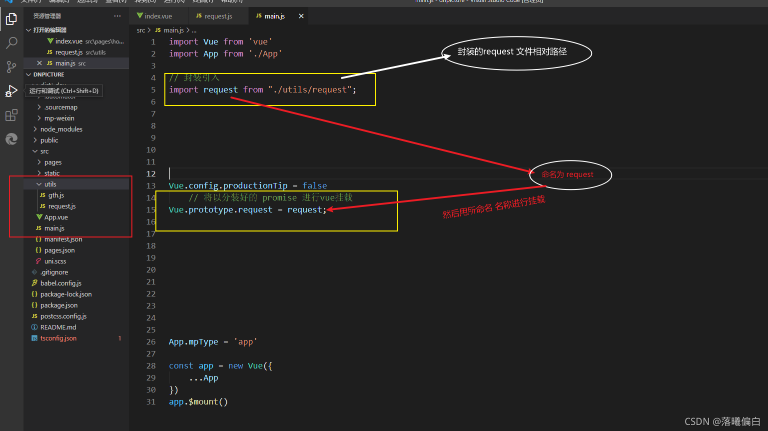 我们去自己的项目工程文件下,找到src目录 然后找到 main.js 文件,然后通过 import 的方式引入刚才 写好的 request.js 封装请求文件,然后命名为 request 通过Vue.prototype.request挂载到vue 原型上,这样的话就挂在完成了。 然后呢 我们来看一下调用这个已经挂载完成的请求封装文件。