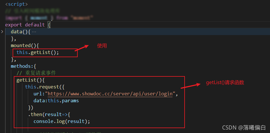 然后,我们可以通过 直接 将请求写入到 mounted(){} 里面, 或者写成一个请求函数(如果涉及到重复加载数据 数据叠加 可以定义成函数的方式),那我们来看一下不涉及到数据重复加载的方式: