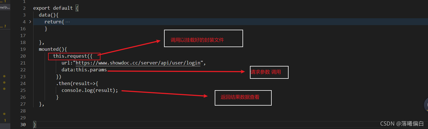 我们将data返回数据写好之后 在mounted(){} 代码段里 通过this.request 方式调用 已经挂载好的封装文件 就可以了,我们的调用就完成啦