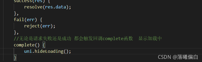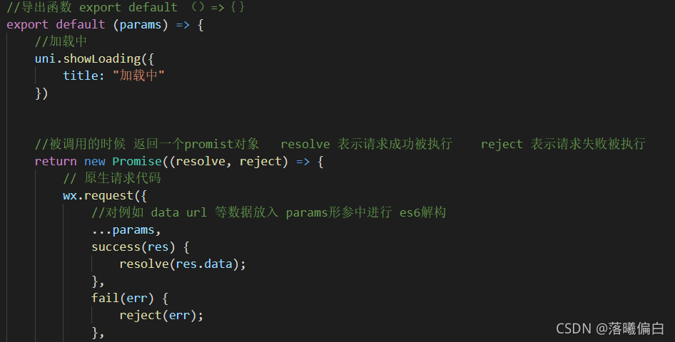 在返回的 请求对象 请求的代码是和微信小程序一样的 但是我们换例外一个方式 ,我们将请求中的 data,url 等数据放入 的请求参数中(params) 然后程序会自动进行es6解构。。(如果想实现 页面在数据加载时实现加载中的一个页面效果,那么可以把 加载中的那段代码写上去。) 方便后面进行其他的操作
