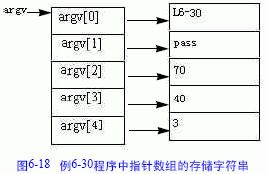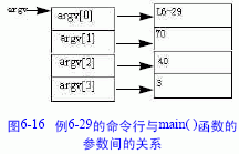 其中program为文件名,也就是一个由program.c经编译、链接后生成的可执行文件program.exe,其后各跟5个参数。对main()函数来说,它的参数argc记录了命令行中命令与参数的个数,共6个,指针数组的大小由参数argc的值决定,即为char*argv[6],指针数组的取值情况如图6-15所示。