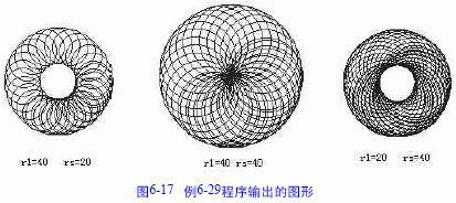 [例6-29] 利用图形库函数绘制一个变化的环。它是把一个半径为R 1的圆周分成n份,然后以每个等分点为圆心,以R s为半径画n个圆(关于作图的详细理论本教材第9章第1节作了专门介绍,这里只作简单分析)。利用m a i n ( )函数的带参数形式,我们可以从键盘以命令行的方式输入R 1和R s及屏幕的背景色。