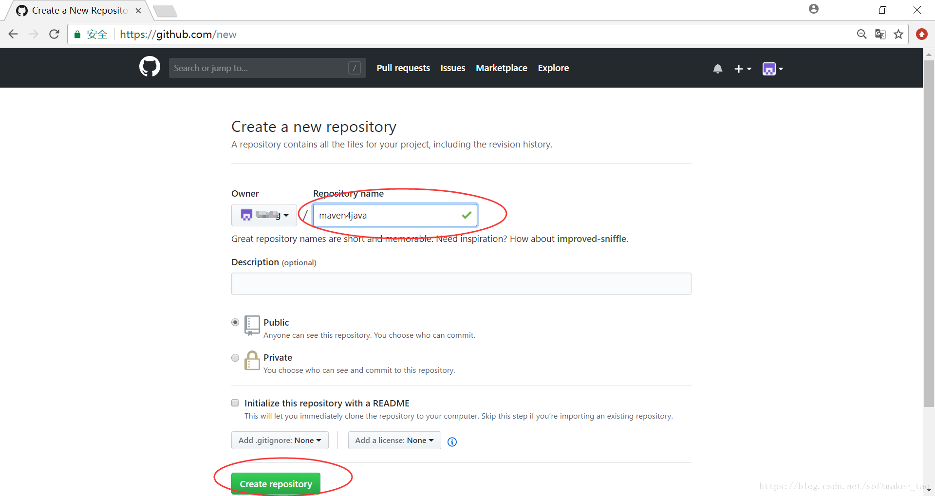 点击新增仓库按钮后,在新增页面根据提示输入仓库名、仓库描述等信息,然后点击创建按钮,创建成功后的页面上会显示仓库的git地址信息(这个地址在上传的时候要用到)。