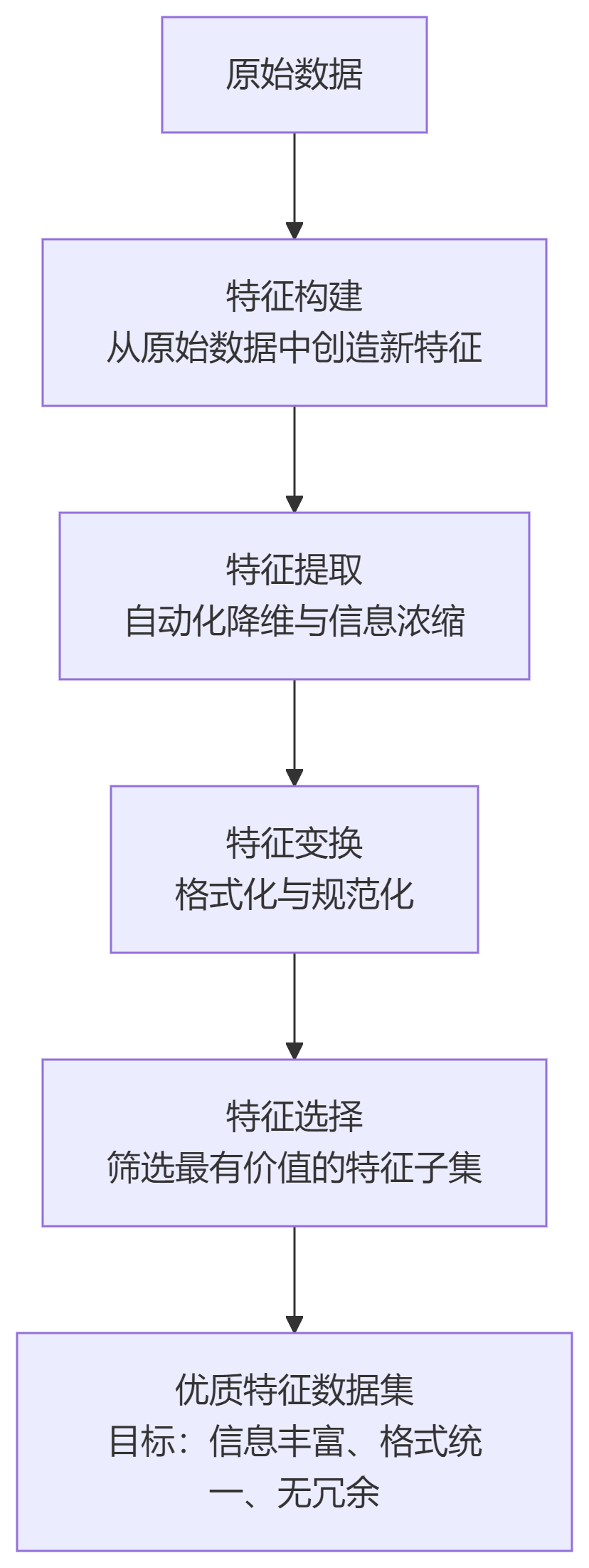 特征工程是一个综合性的过程,主要包括以下几个核心任务,其工作流和产出目标如下图所示: