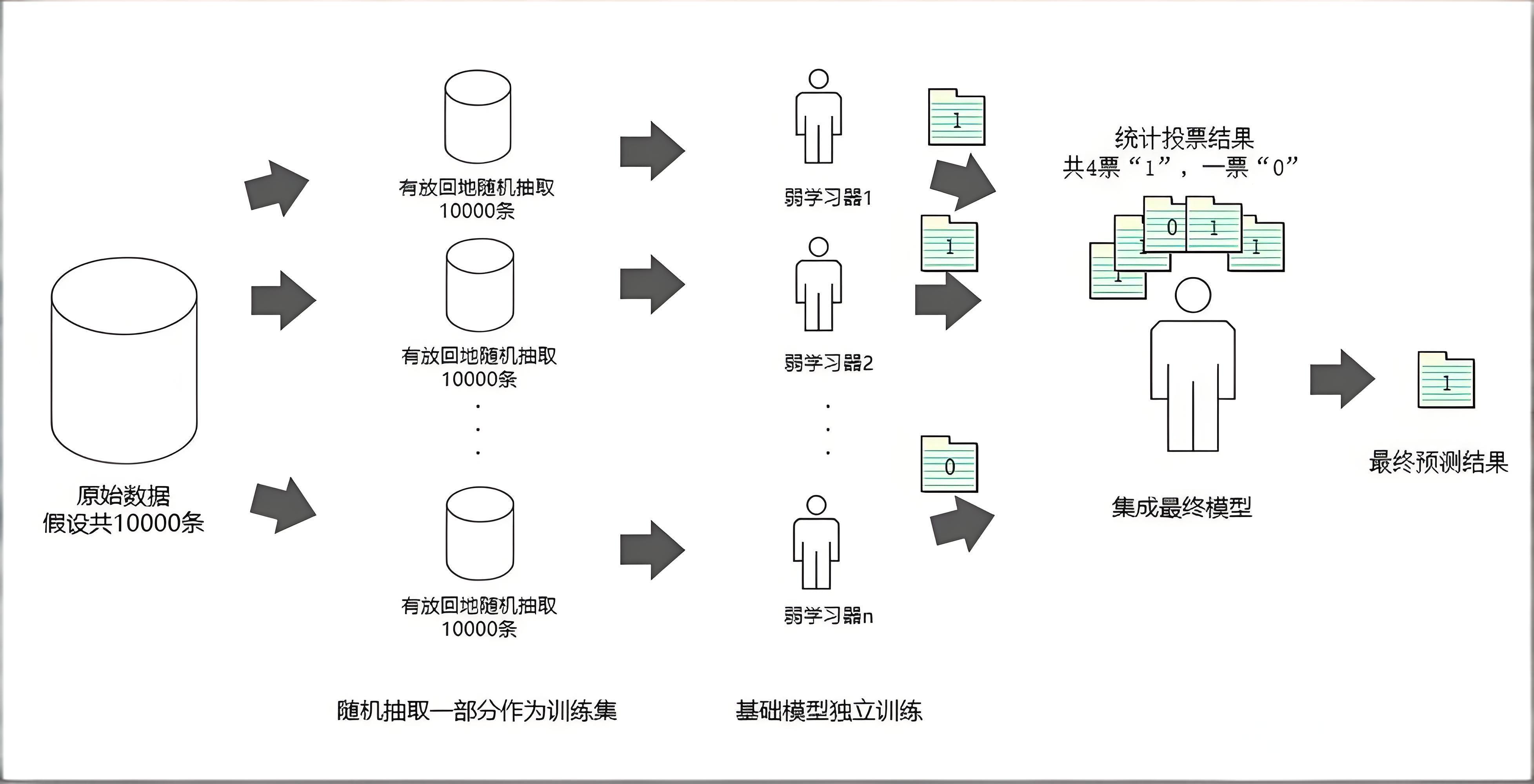 | 模型权重 | 所有基学习器权重相等 | 表现更好的基学习器获得更高权重 |
