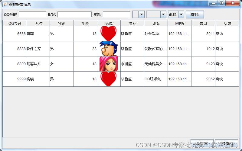 1.使用Swing组件制作查找好友界面,JTable控件与TableModel模型显示复杂数据;