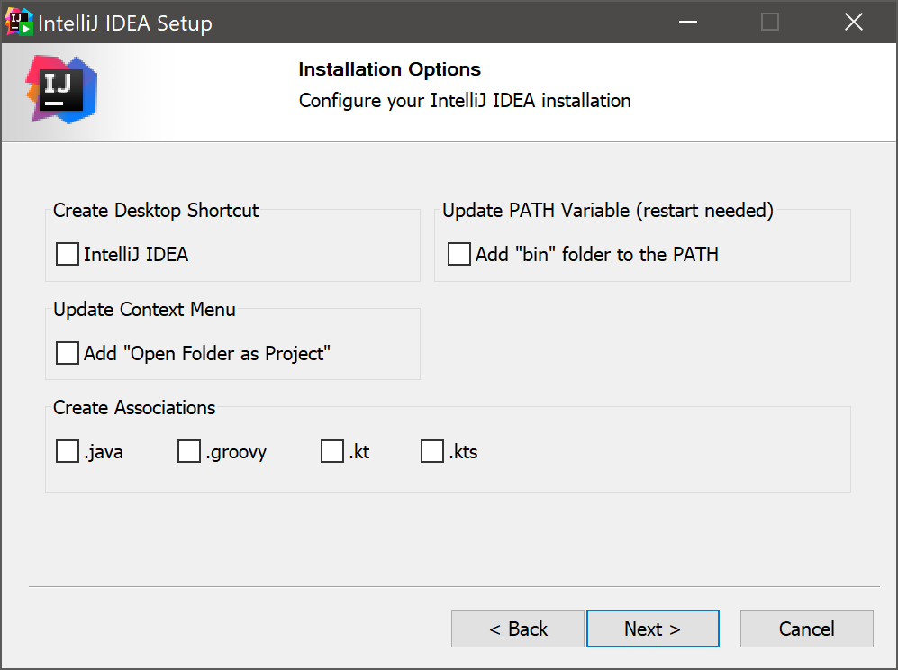 /CONFIG并以管理员身份运行安装程序。如果没有静默配置文件,安装程序将忽略所有附加选项:它不会创建桌面快捷方式、添加关联或更新变量PATH。但是,它仍会在JetBrains下的“开始”菜单中创建一个快捷方式。