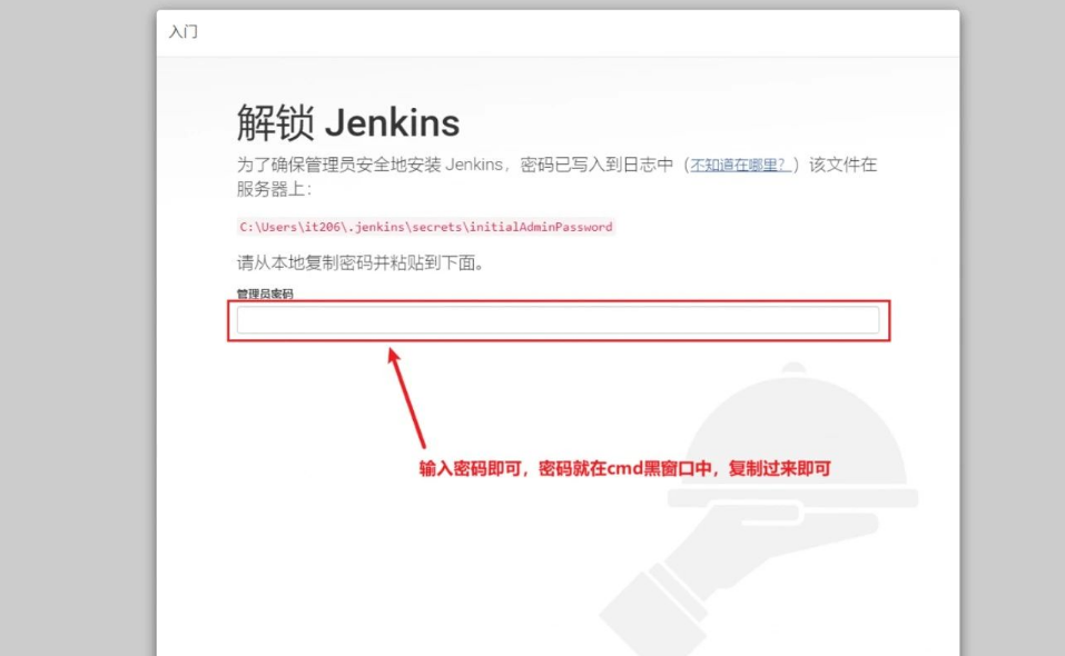 4、重启jenkins,再访问http://localhost:8080,就会进入到密码认证界面: