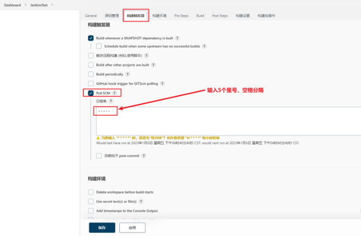 继续往下翻,构建触发器处,勾选Poll SCM,并输入如下信息:
