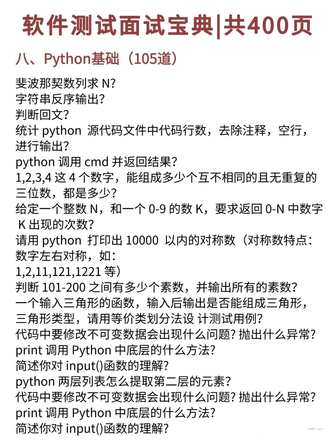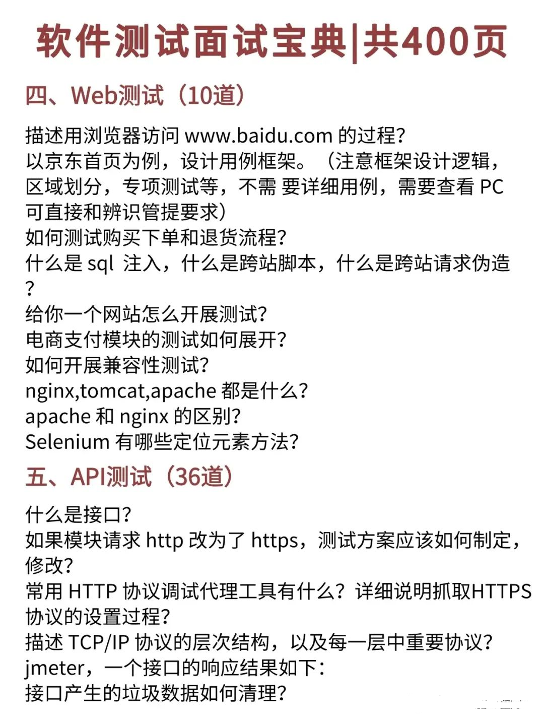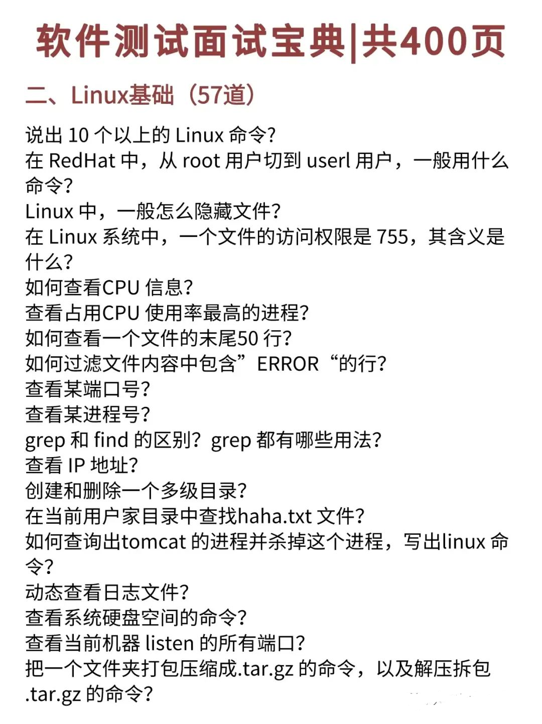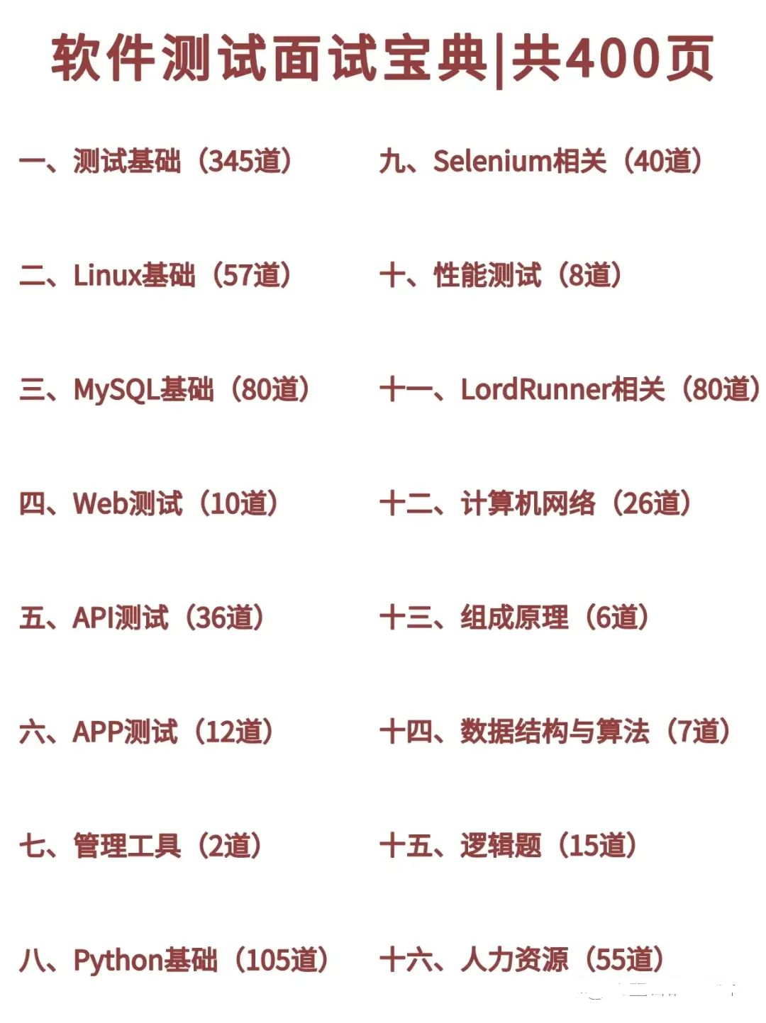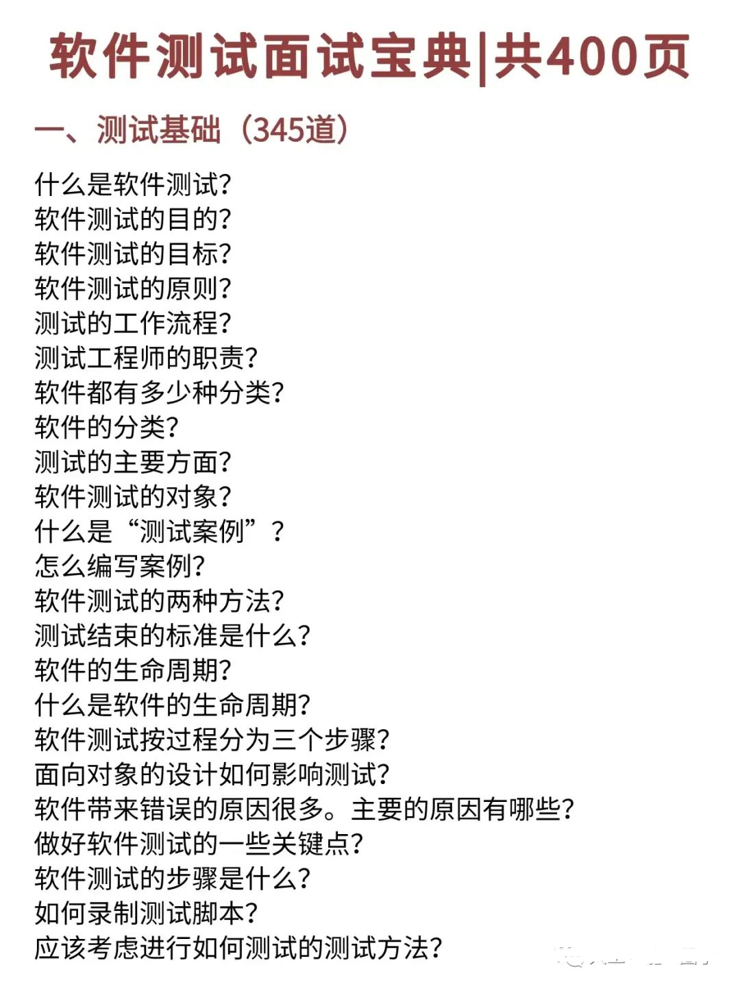 今天给小伙伴们整理了一份大佬整理的400页软件测试的面试题,涵盖了16方面的内容,非常经典!