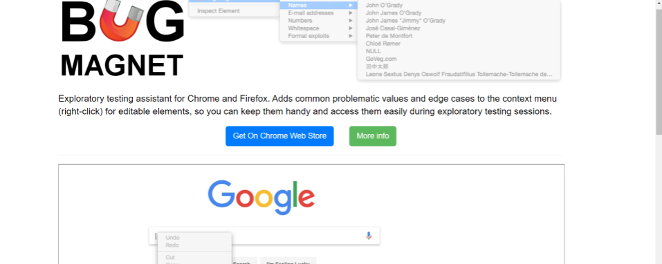 Bug Magnet是Chrome和Firefox的会话测试程序,该工具帮助你包括常见的有问题的值和边界情况。