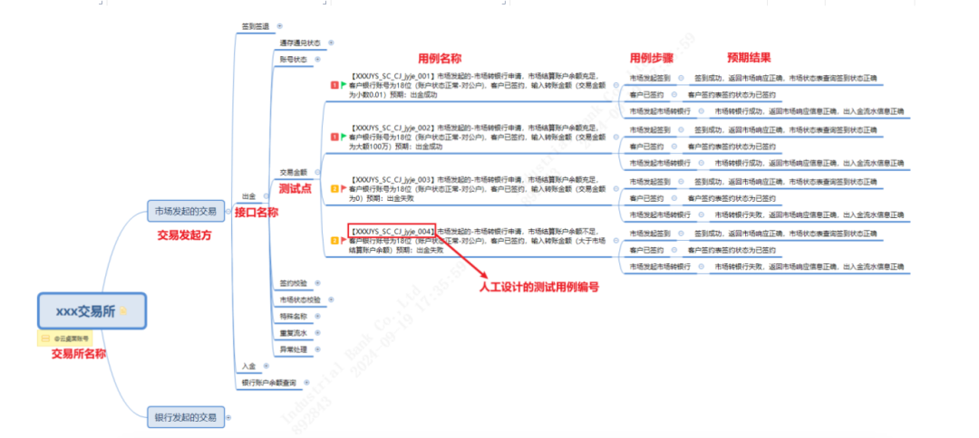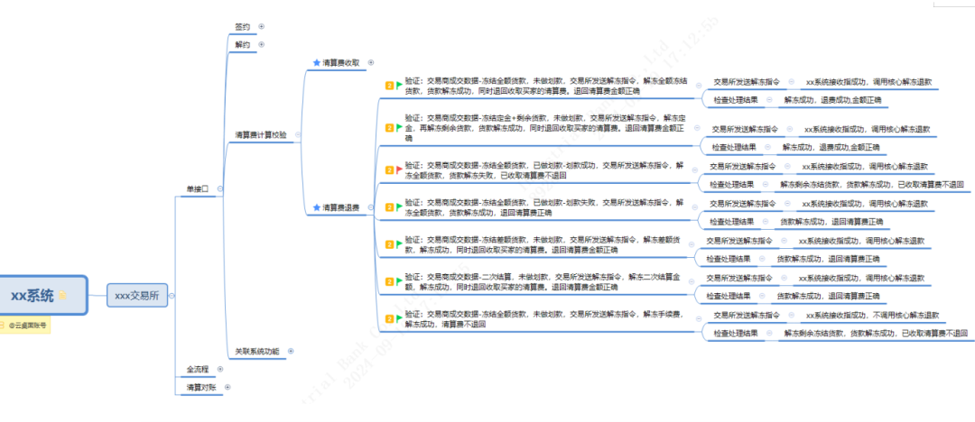 借助Xcase工具已能够灵活维护一整套系统级的案例库,新的交易所接入时,能够复用原有测试用例,或对用例进行新增或修改,减少手工逐条维护的测试工作量,来达到更好的测试效果,同时也能快速挑选出系统主要业务交易进行回归测试,保障系统质量。银商转账系统结合业务特点,以交易所作为场景分类父节点、梳理了交易所维度的测试用例思维导图,具体如下: