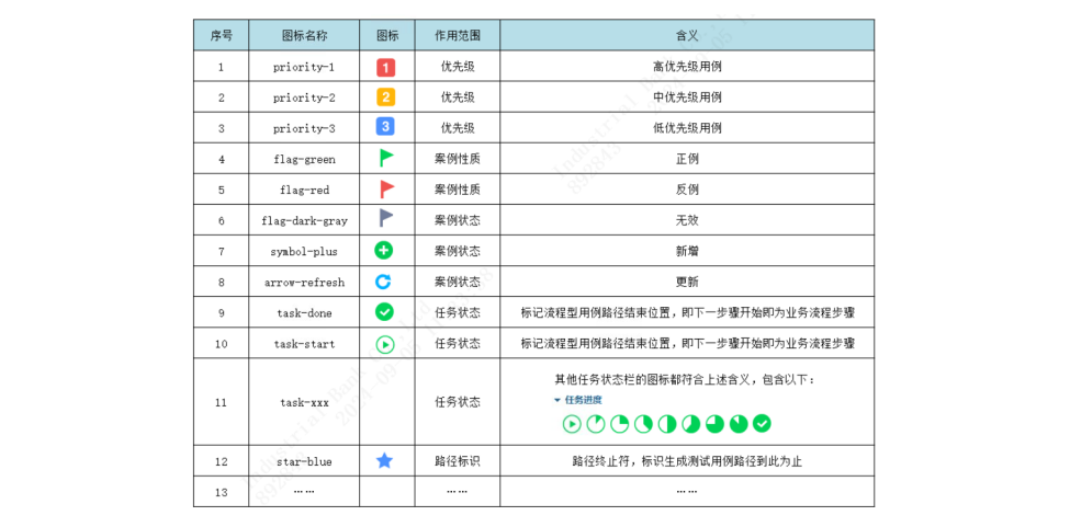 具体来说,导图画布中的主题为系统名称或需求名称,子主题依次分别为功能模块、接口、测试点、测试用例名称、步骤和预期结果。这样一来,测试用例的关键要素基本有了,一套完整的测试用例由之产生。此外,导图中还可以用添加图标的方式,标识出与测试用例一一对应的案例性质、优先级等,如下图所示。