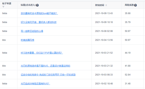 至于另一方面,主动发现问题,曾经我们的习惯是版本发布后,由值班QA定期去贴吧、论坛、微博等渠道扫玩家言论,发现BUG或吐槽后给策划或技术开单处理。随着平台化的进步,现在的舆论监控主要由两部分组成,一部分是对游戏内的敏感言论做捕捉,另一部分是雷火渠道信息收集平台,主要用于监控各大平台(论坛、贴吧、taptap)的反馈,根据标题贴近BUG的程度计算风险系数并录入。