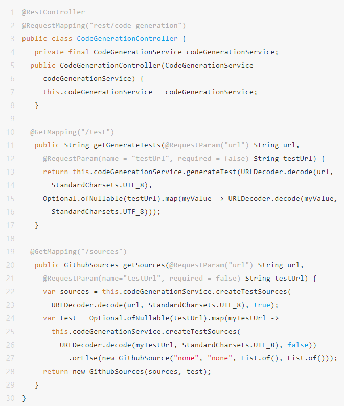 代码生成控制器 “有一个 ”getSources(...) "方法。该方法获取要生成测试的类的 URL 和可选的 testUrl,以及可选的示例测试。它对请求参数进行解码,并调用 “createTestSources(...) ”方法。该方法会返回 “GithubSources”,其中包含要测试的类的源代码、其在项目中的依赖关系以及测试示例。