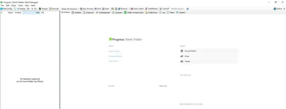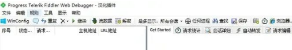4、重启Fiddler、菜单栏常用功能菜单已经是中文了、需切换为英文则将上面两个文件移除即可。